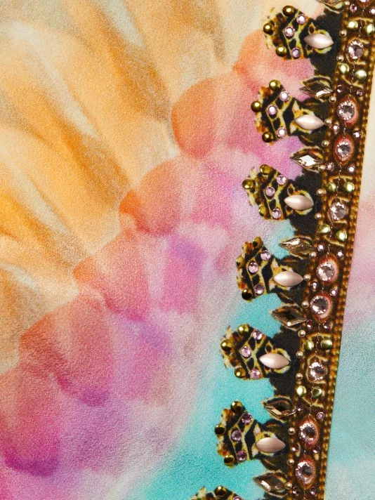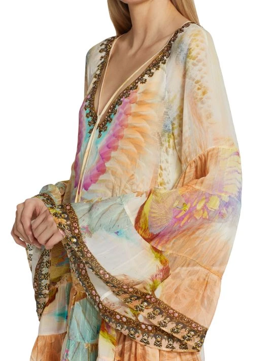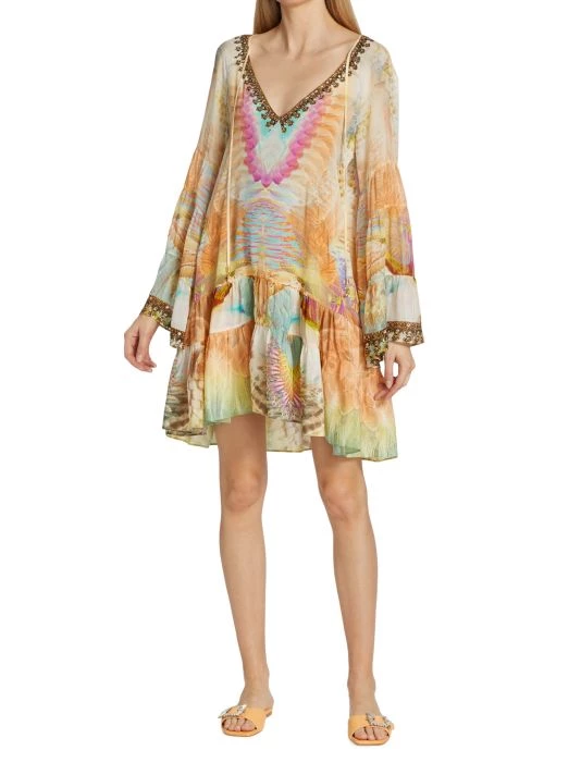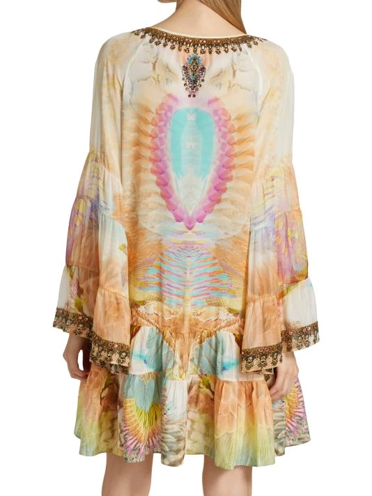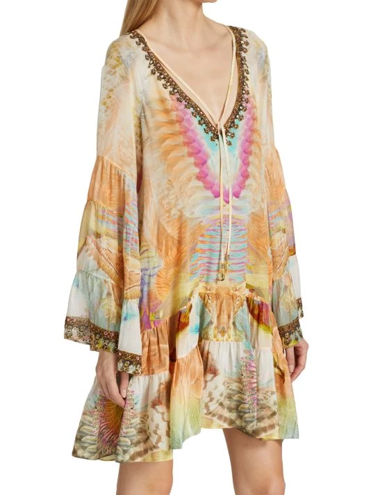 From the Take Flight Collection. Detailed with embroidered edges, CAMILLA’s A-line minidress is crafted of printed silk. This relaxed-fit piece is finished with a tiered hemline.