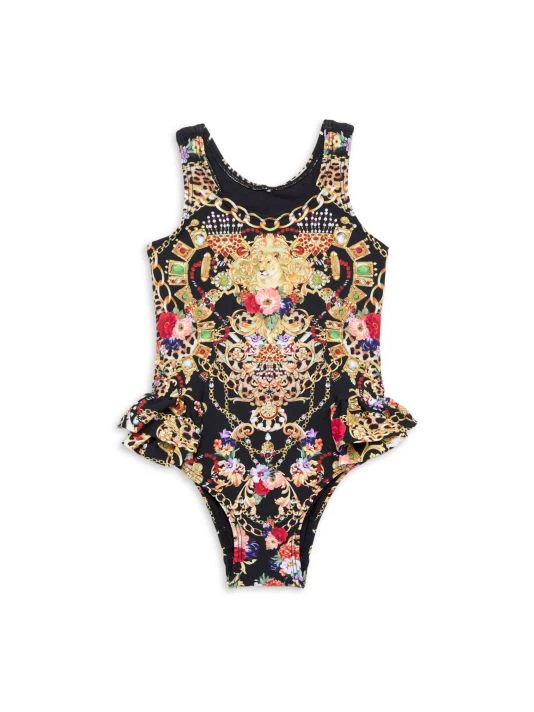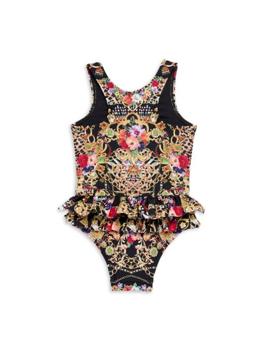 From the Party Like Collection. This one-piece swimsuit in a jewelry-inspired abstract print is detailed with a ruffle accent at the back.