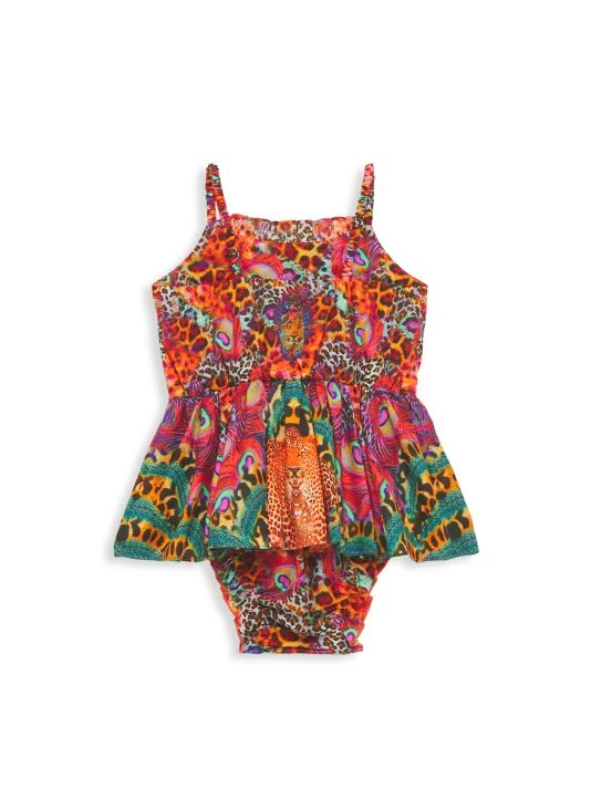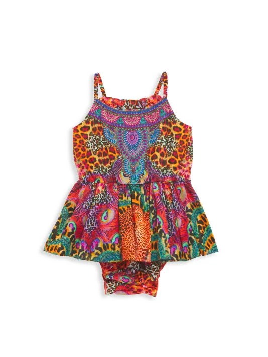 From the Xanadu Rising Collection. This ballerina-style dress in an animal-inspired print features bloomers attached.