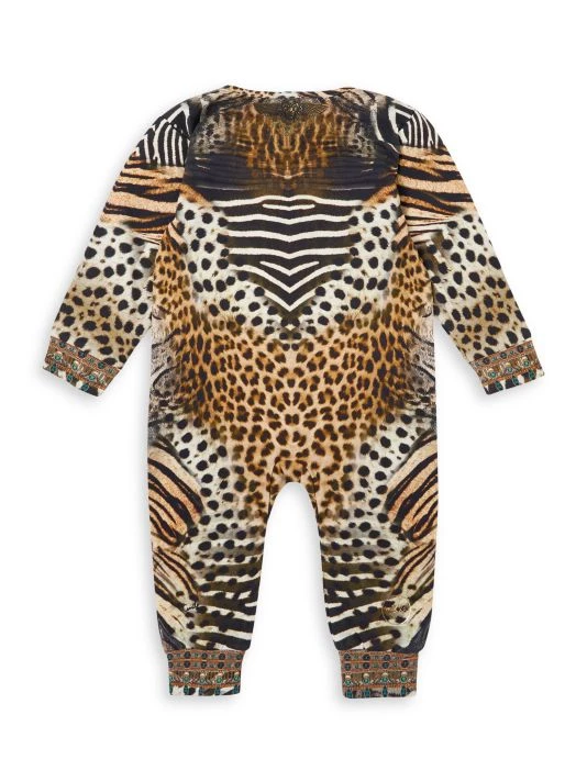 Crafted of stretch cotton, this animal print romper is finished with trompe-l’oeil bejeweled trim.