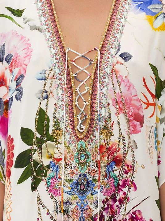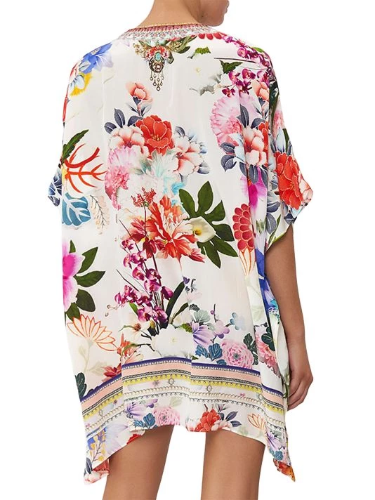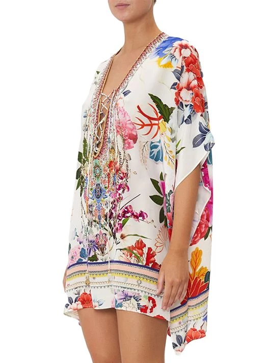 Woven from luxe silk, CAMILLA’s caftan-inspired minidress boasts a boxy silhouette. A large painterly floral print and lace-up V-neck offer playful styling.
