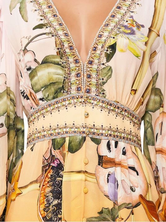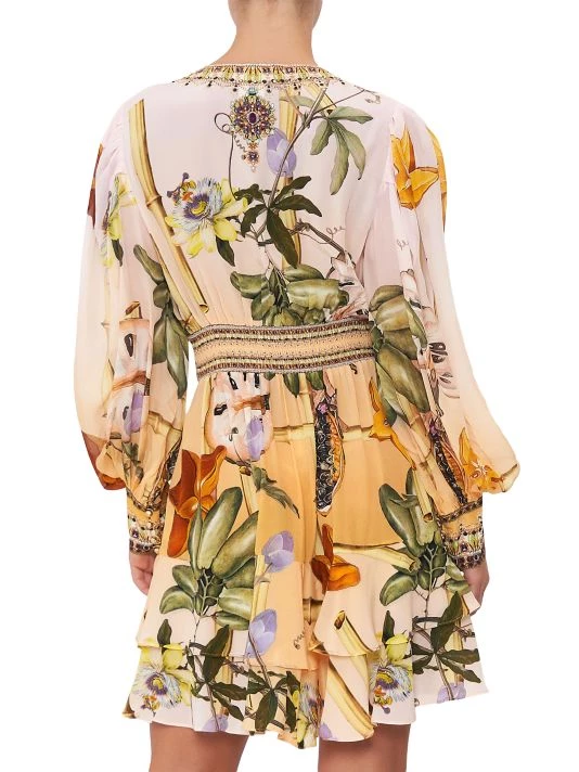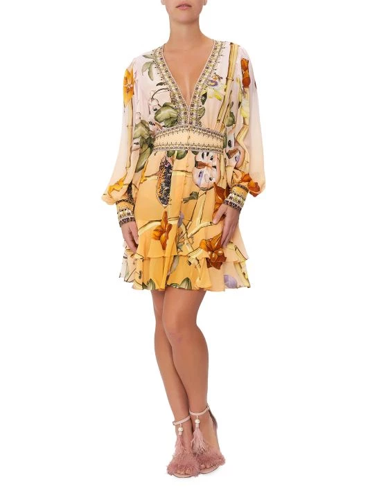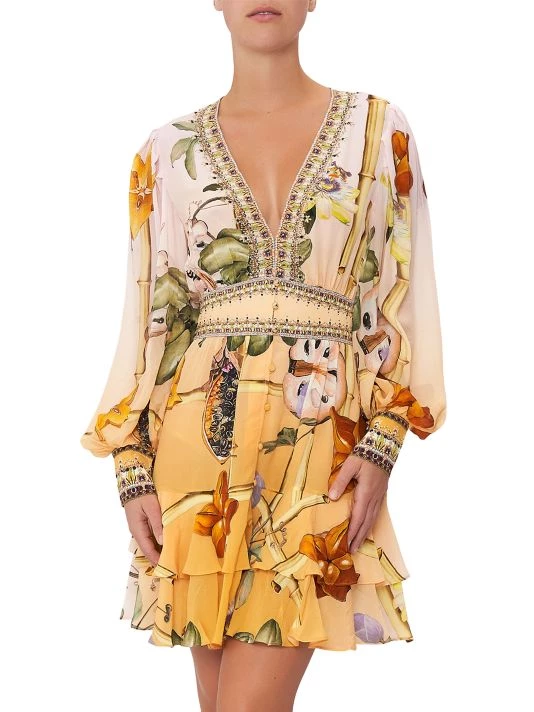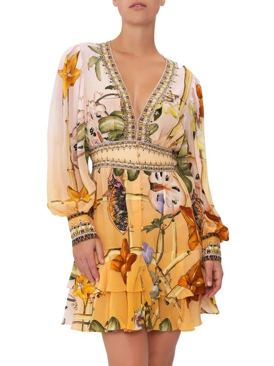Crafted of silk, Shoshanna’s floral-print minidress features a plunging V-neck, voluminous bishop sleeves, and frill skirt.