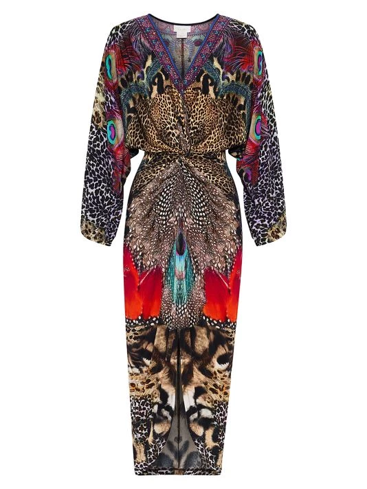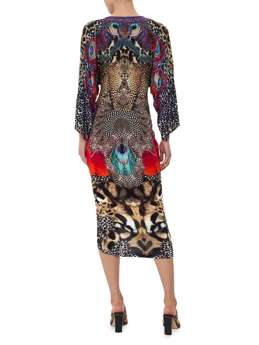 From the Xanadu Rising Collection. Signature hand-drawn prints are a specialty of Australian ready-to-wear label CAMILLA. Crafted of silk, this maxi dress is decorated with images of peacock feathers and a bold leopard print.