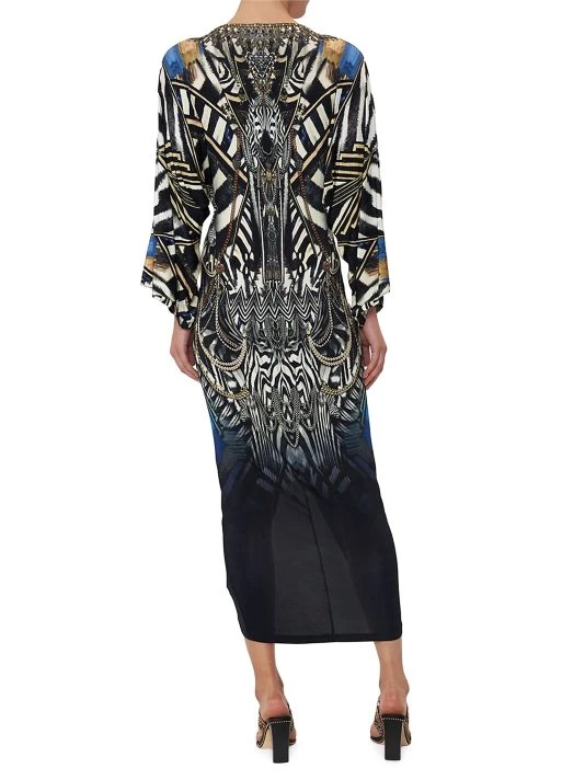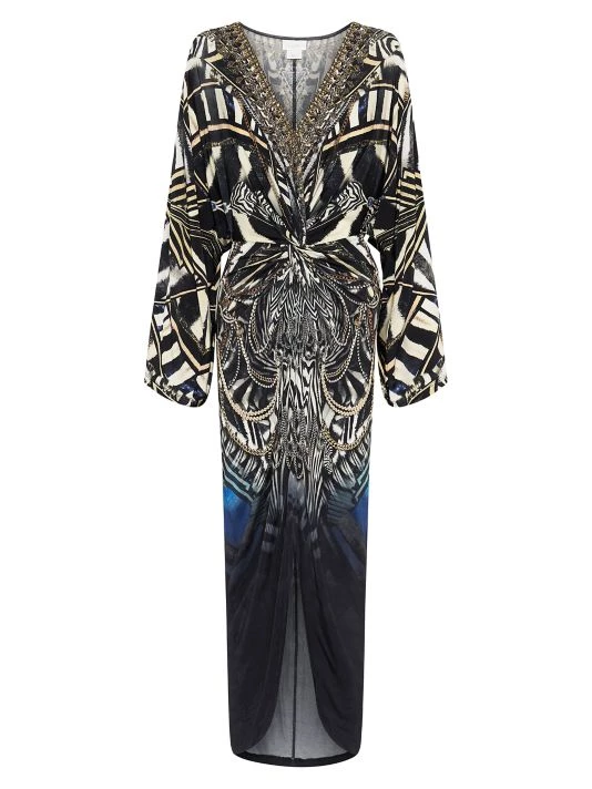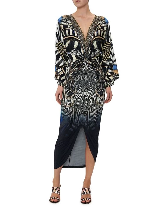 From the Knight of the Wild Collection. CAMILLA’s long-sleeve midi-dress is enhanced by a dimensional twisted waist and front slit. Cut in an asymmetric silhouette, this style is elevated by mixed chain and abstract prints.