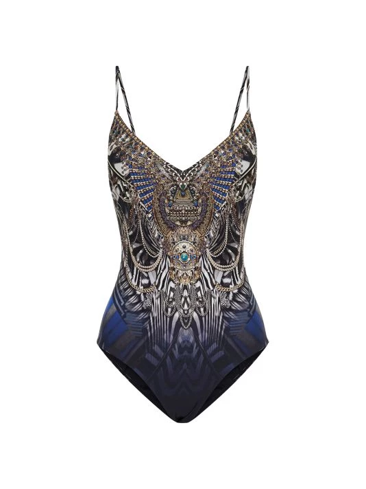 Designed with a lace-up back, this one-piece swimsuit by CAMILLA is crafted of stretch fabric with a bold print signature to the label.