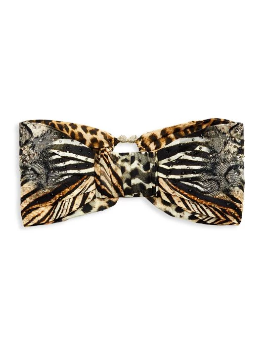 This wide headband from CAMILLA is crafted of leopard-print silk. An O-ring detail with a leopard-head motif and sparkling crystals elevate the look.