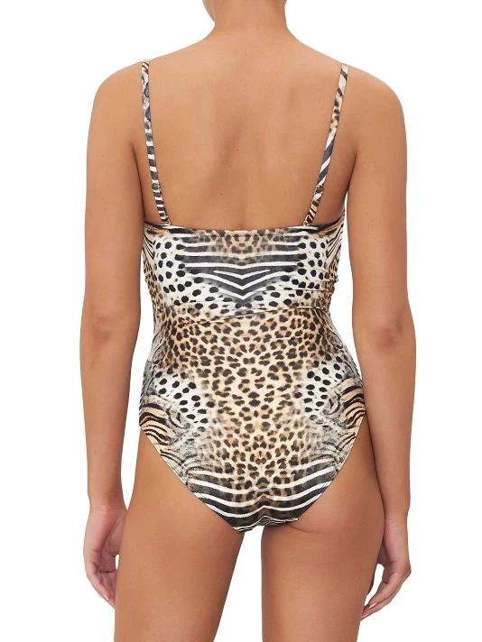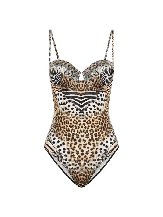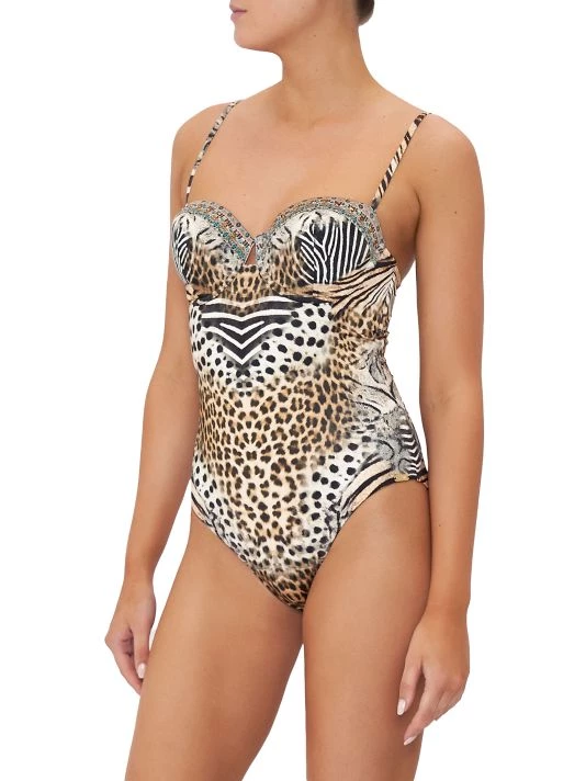 This leopard-print one-piece swimsuit from CAMILLA features molded underwire cups. Wide-set spaghetti straps and contrast trim at the neckline add flair to this timeless silhouette.