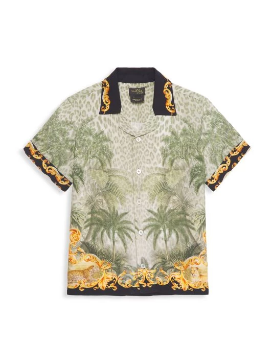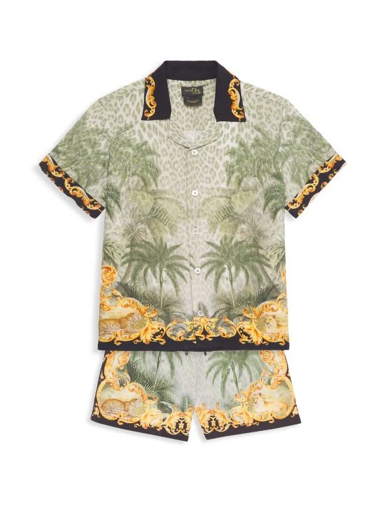 From The Party Like Collection. Showcasing a contrast trim with ornate designs and feline graphics, this stylish shirt features illustrated palm trees and a tonal leopard print.