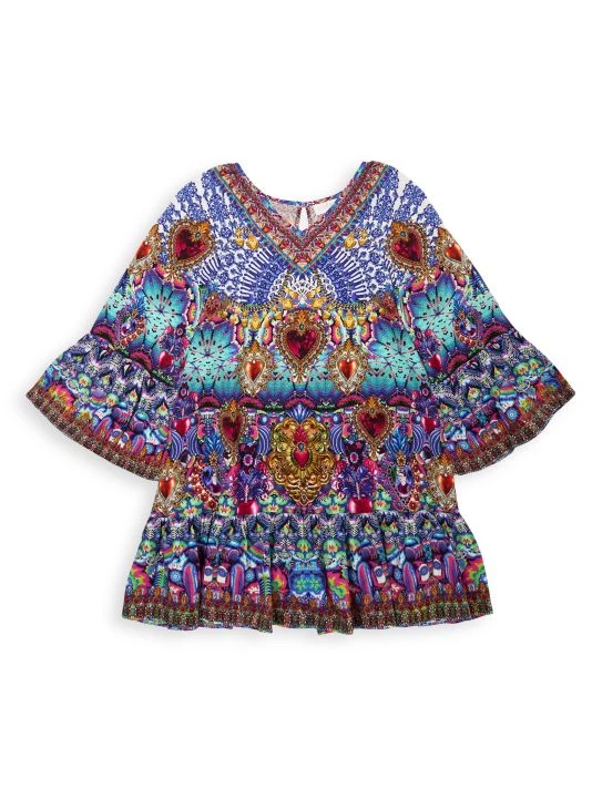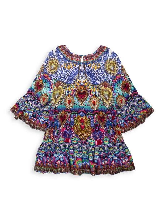 Showcasing an eclectic mosaic print, this dress boasts an A-line silhouette with gathered ruffles.