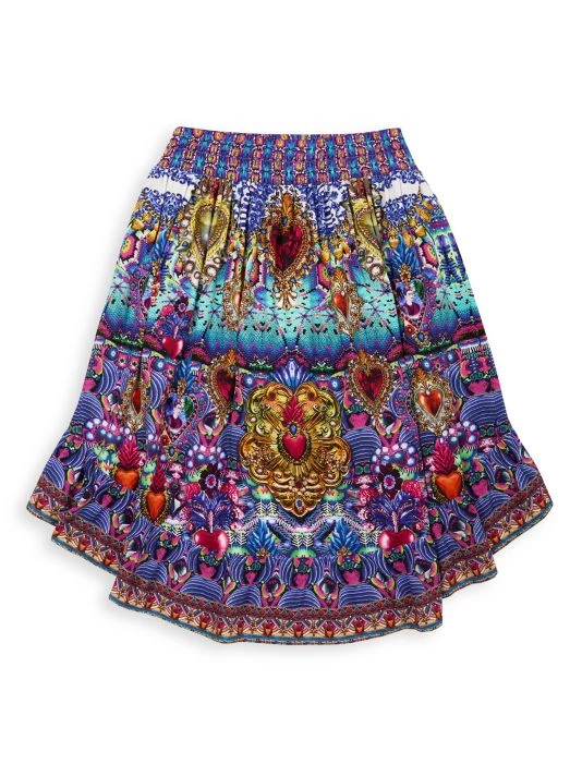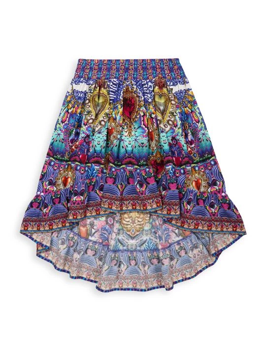 Designed with a high-low hem, CAMILLA’S colorful skirt features a vivid mosaic featuring intricate amulet graphics and crystal embellishments.