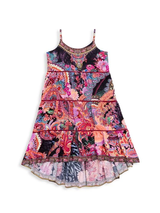 From the Runaway Royal Collection. Adorned with a paisley and floral motif, this tiered dress is defined by detailed neck and high-low hem.