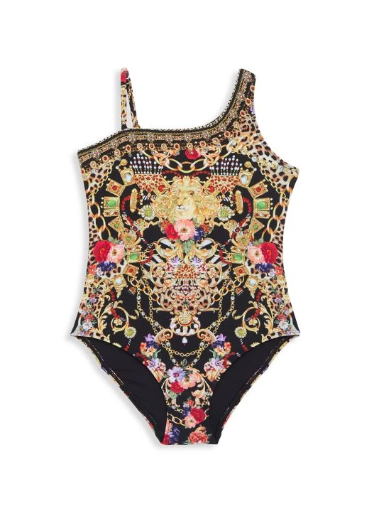 From the Party Like Collection. This one-piece swimsuit is adorned with a jewel-inspired print and an asymmetrical neckline.