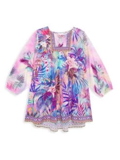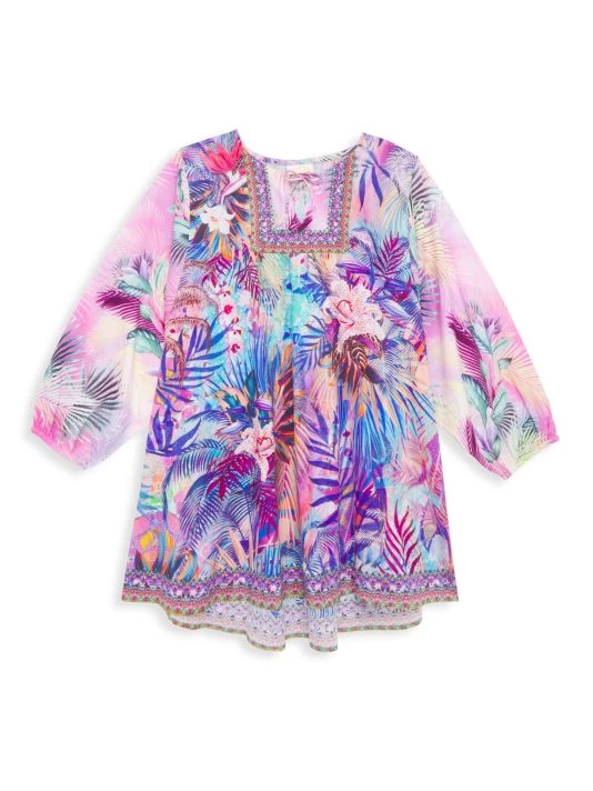 From the Party Like Collection. This long-sleeved trapeze dress is adorned with palm tree-inspired print and a self-tie closure at the neckline.