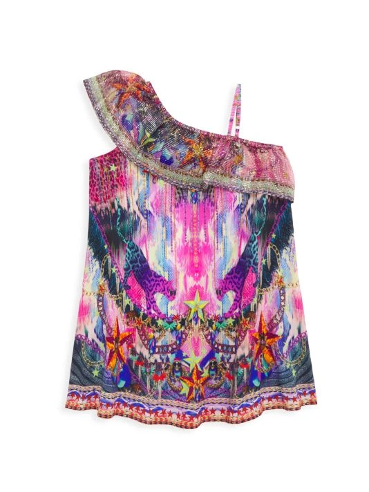 From the Party Like Collection. This one-shoulder flounce dress is detailed with ruffle trim at the neckline and an abstract animal print.