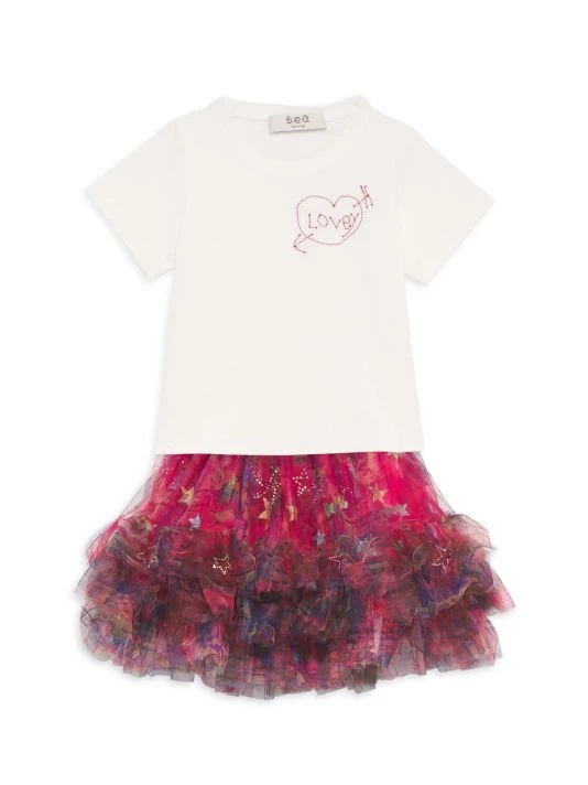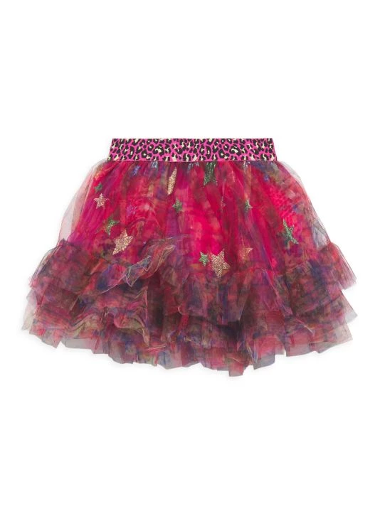 From the Party Like Collection. This tie-dye tutu-style skirt features glitter star details and a vibrant leopard print waistband.