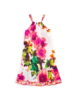 From the Pretty As A Poppy Collection. Sleeveless shift dress in a vibrant floral print is detailed with a frill hem and the brand’s signature multicolor crystal embellishments.