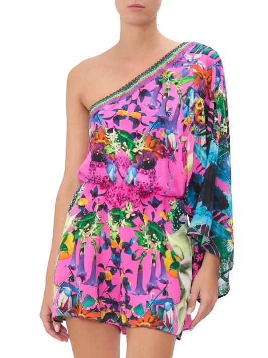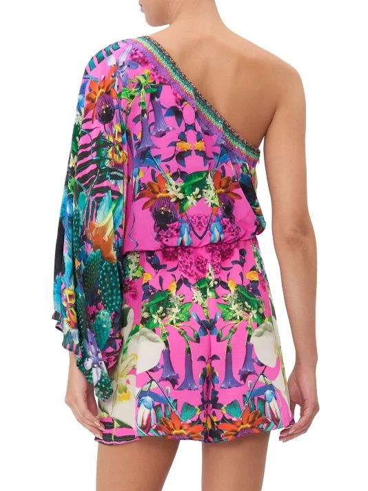 Cut in a one-shoulder silhouette, CAMILLA’s silk romper boasts painterly floral print and micro beaded embellishments.