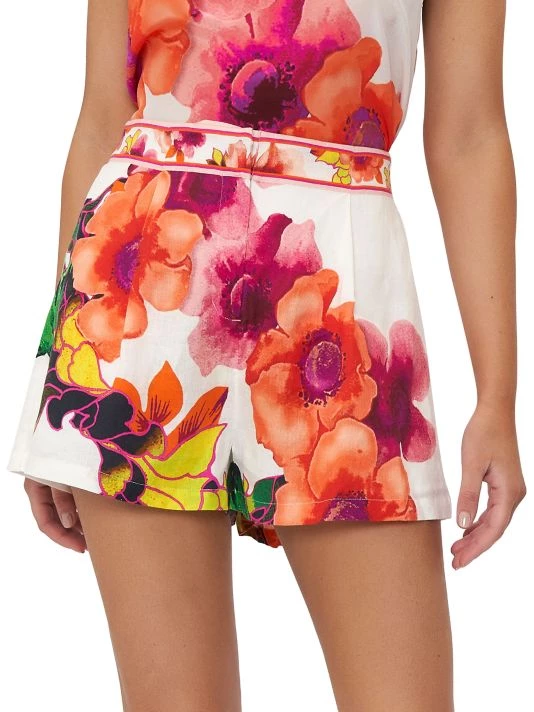 From the Pretty As A Poppy Collection. These vibrant floral shorts are tailored with a front tuck, crafted of lightweight linen.