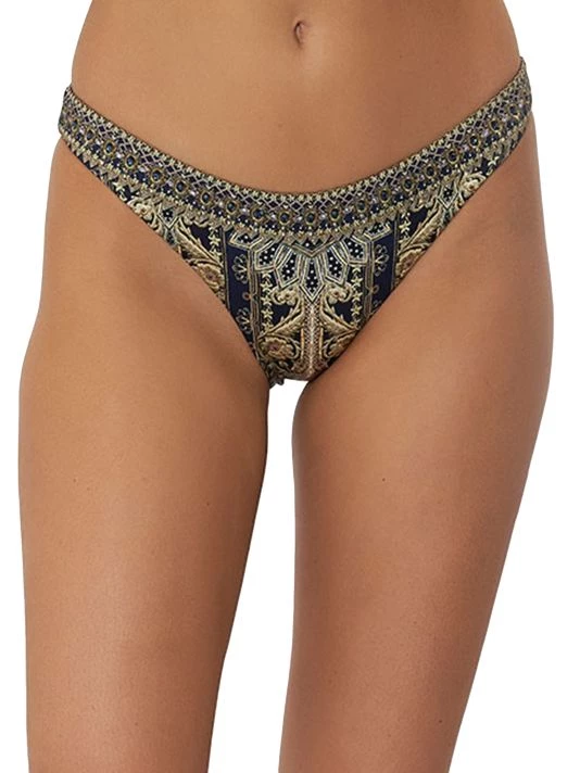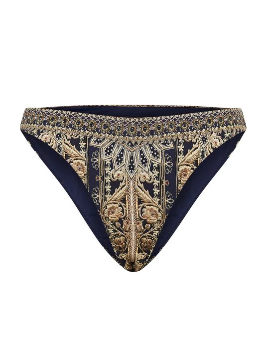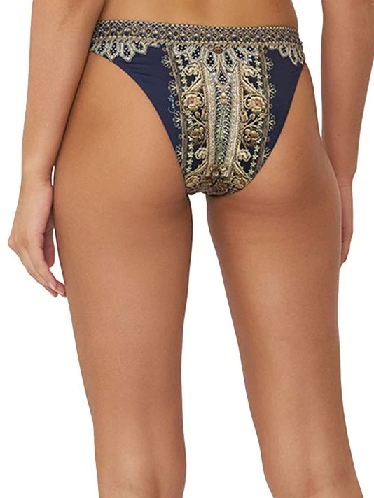 This bikini bottom is crafted from a stretch fabric with an ornate pattern.