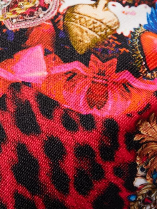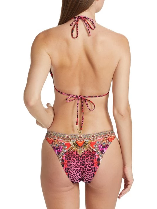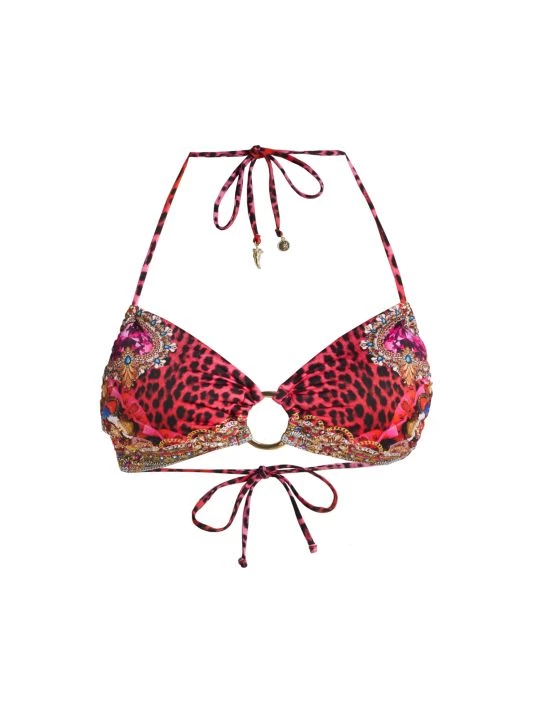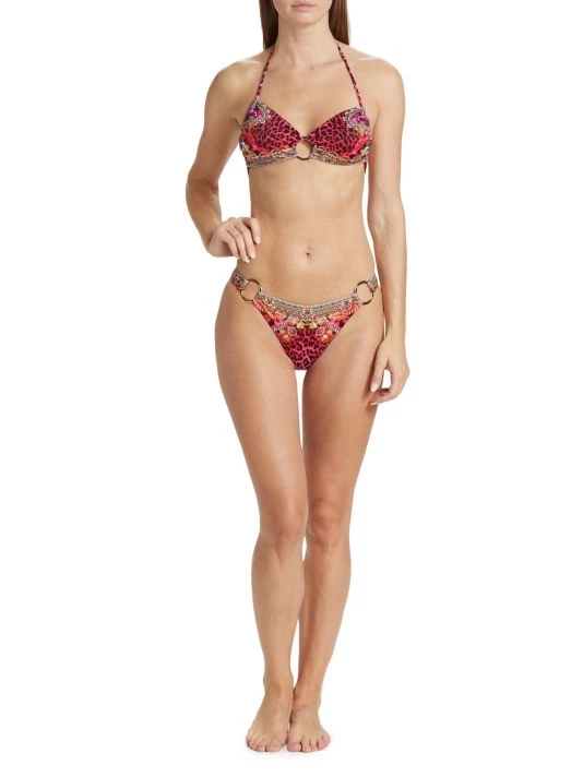 CAMILLA’s halterneck bikini top is elevated by mixed prints and a metal goldtone circle embellishment at the front.