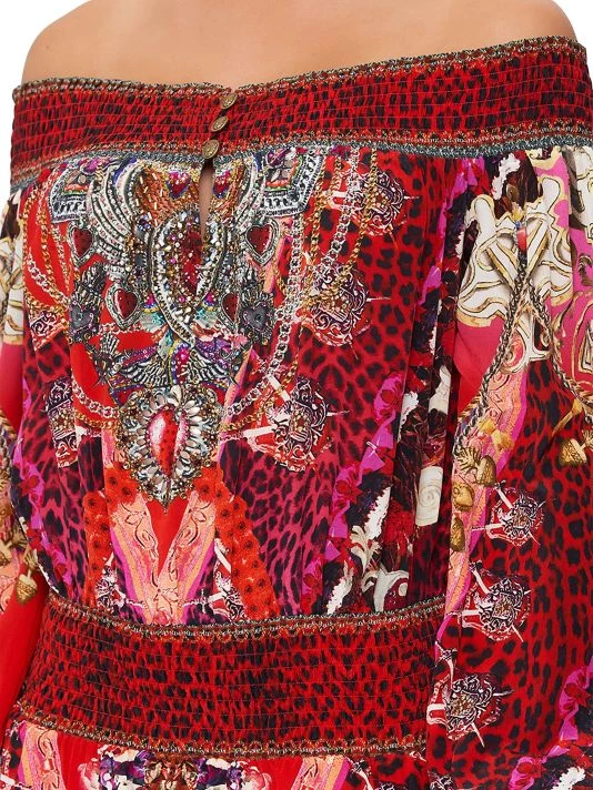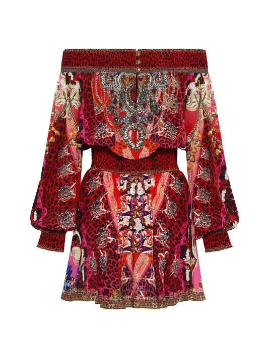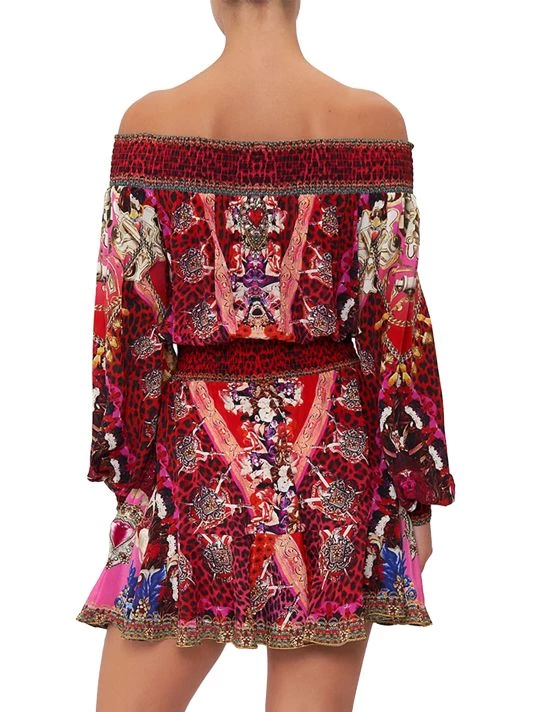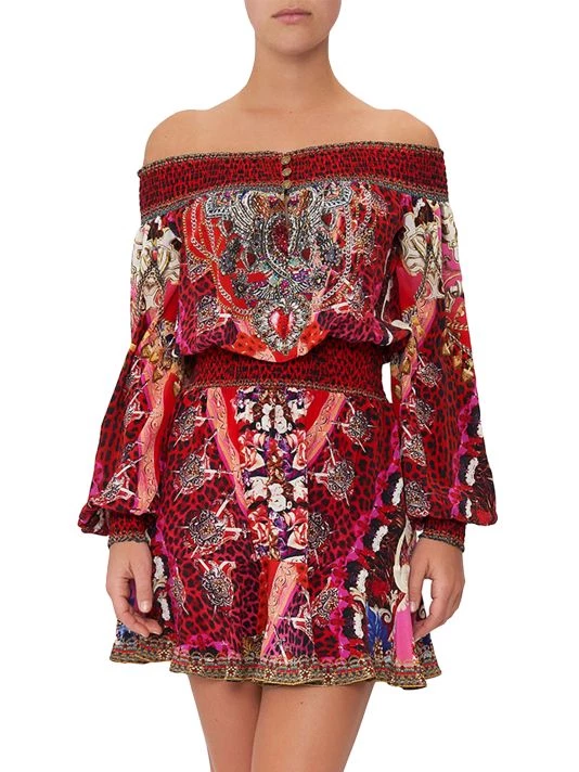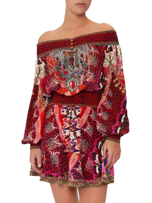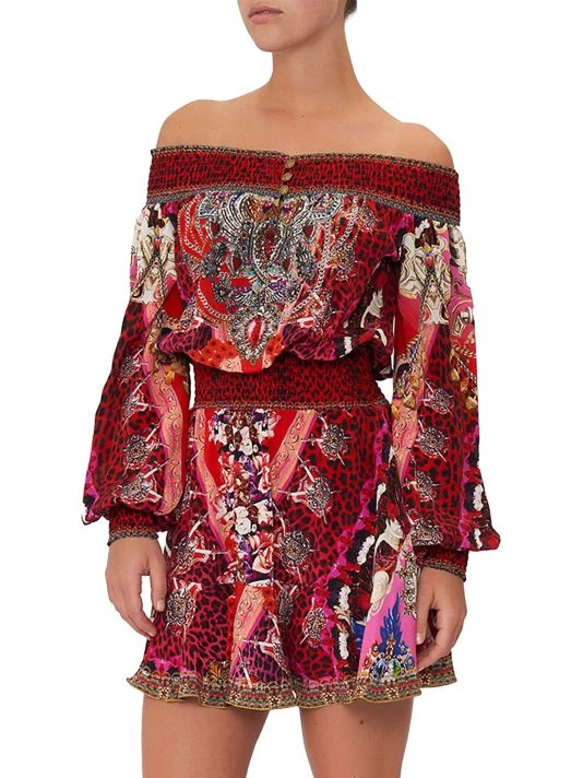 This printed silk minidress from CAMILLA features a blouson bodice with a smocked off-the-shoulder neckline and waistband. Long bishop sleeves and a front button detail finish the look.