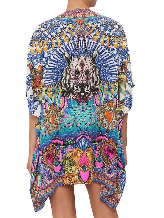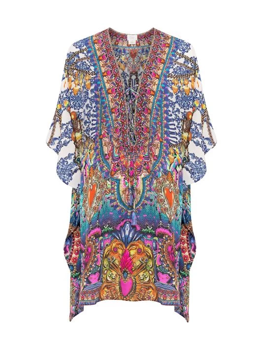 CAMILLA’s printed silk short kaftan features a draped silhouette with short sleeves and a lace-up front.