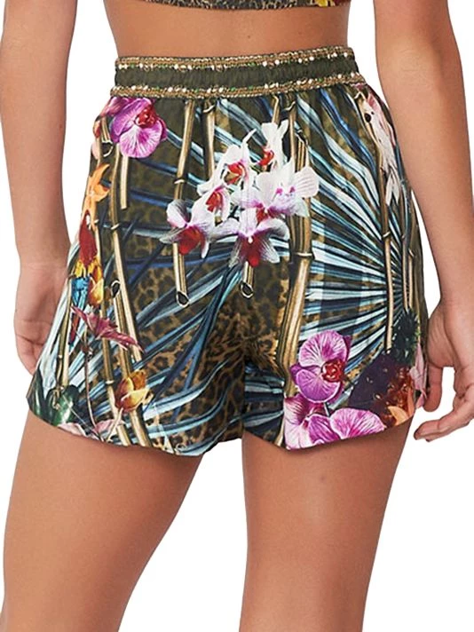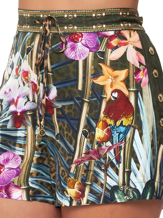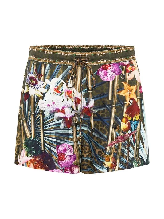 Camilla’s printed utility shorts are crafted from silk, featuring a drawstring waist and slit pockets at the sides.
