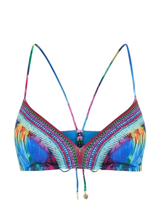 This knit V-neck bikini top is complete with mixed abstract prints and a self-tie criss-cross back.