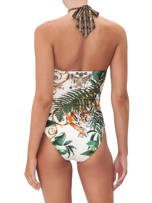 Featuring a flattering halterneck with ring detail, CAMILLA’s printed swimsuit is cut with high legs.