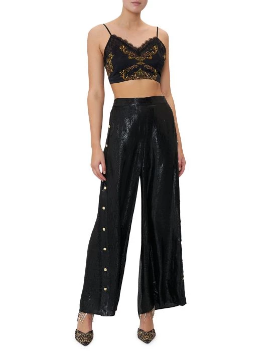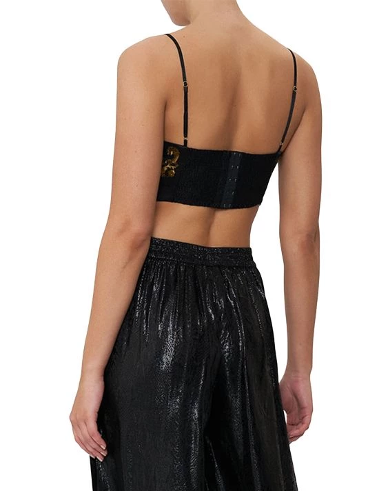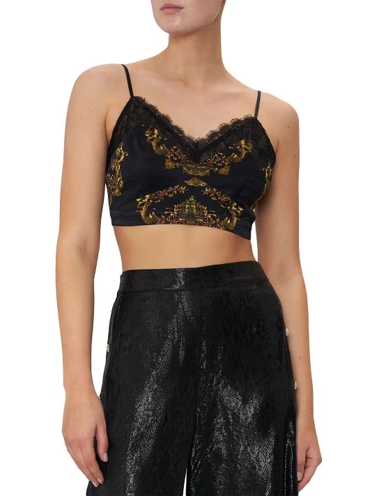 From the Shadows of Armada Collection. Woven from luxe silk, CAMILLA’s bralette is complete with a smocked back. A lace-embellished V-neck complement’s the style’s abstract print.