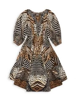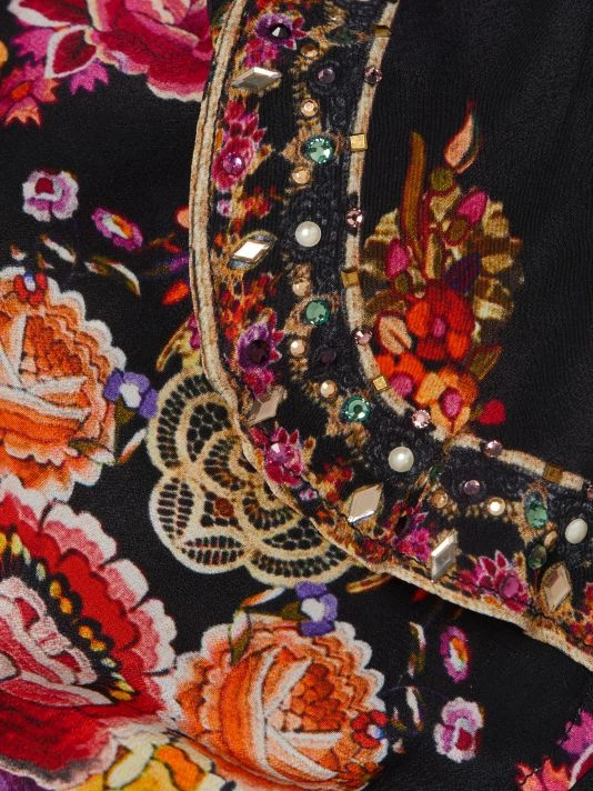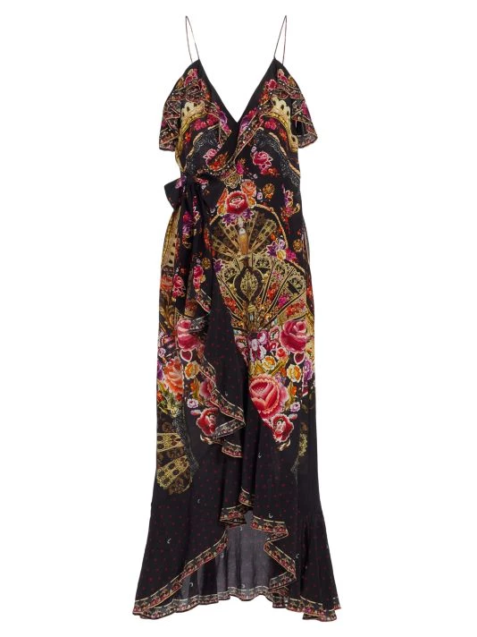 This printed CAMILLA maxi dress is crafted of pure silk. A true wrap-front closure cinches the waist, while a ruffled neckline and hem add movement to this flowing style.