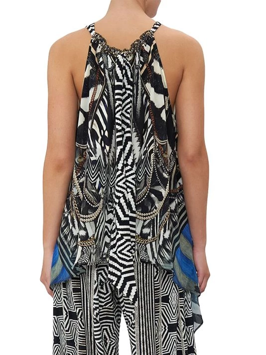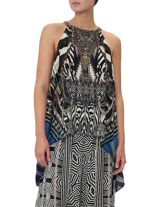 This CAMILLA tank top is crafted of silk with a bold print signature to the label.