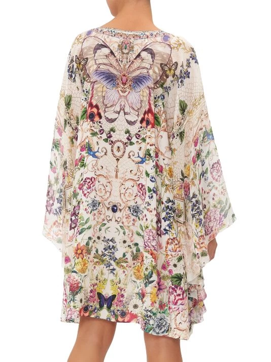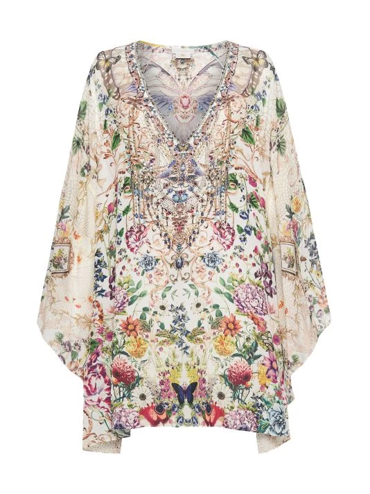Crafted of printed silk, CAMILLA’s V-neck kaftan flaunts voluminous raglan sleeves complemented by an asymmetrical flared hem.